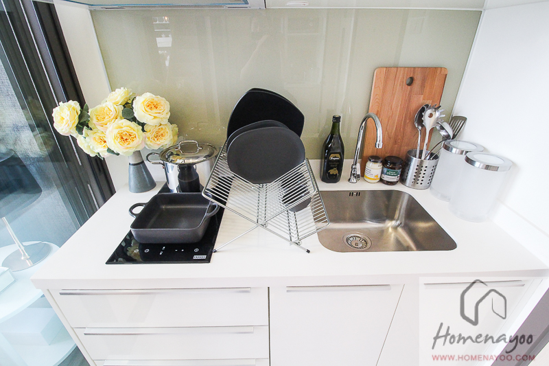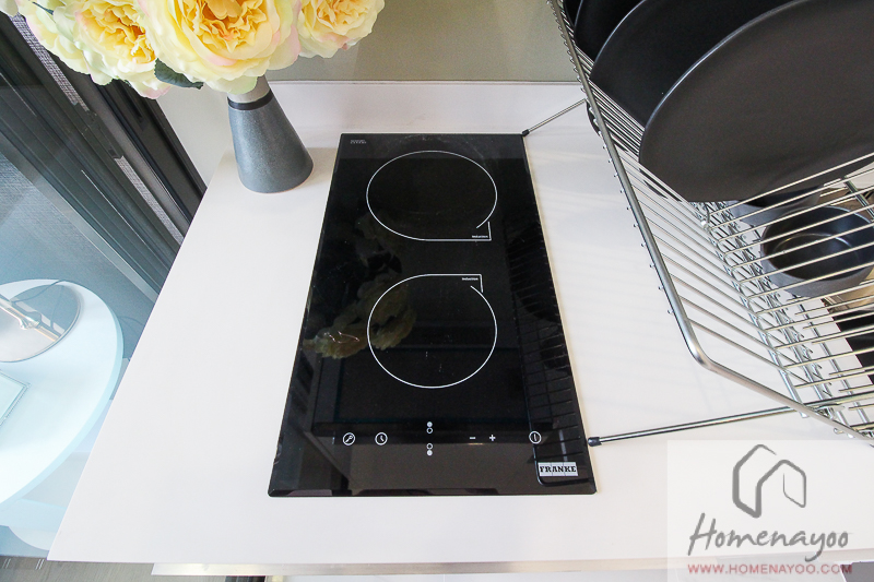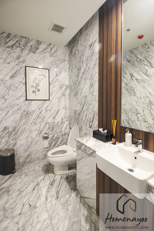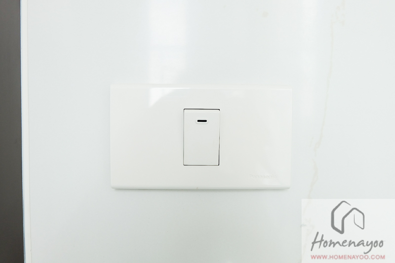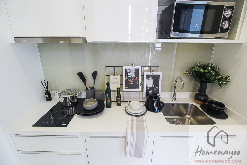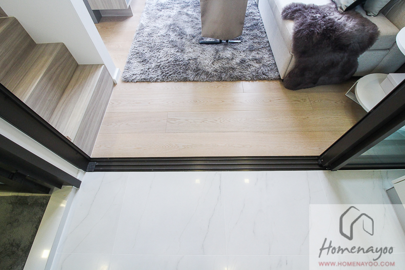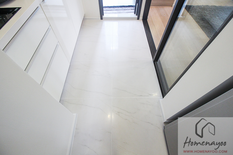 พื้นห้องครัวได้กระเบื้องพอร์ชเลน ลายหินอ่อน, พื้นห้องนั่งเล่น Engineering Wood, ประตูบานกรอบอลูมิเนียม สี Brown, เคาน์เตอร์ครัว Top หินเทียม หน้าบาน Hi Gloss พร้อม Hob & Hood, เตาไฟฟ้า 2 หัว, ห้องน้ำแยกส่วนแห้งส่วนเปียก สุขภัณฑ์ภายในห้องน้ำ TOTO ได้โถสุขภัณฑ์แบบ Washlet พร้อมฉากกั้นอาบน้ำแบบกระจก Tempered, ไฟในห้องแบบดาวน์ไลท์