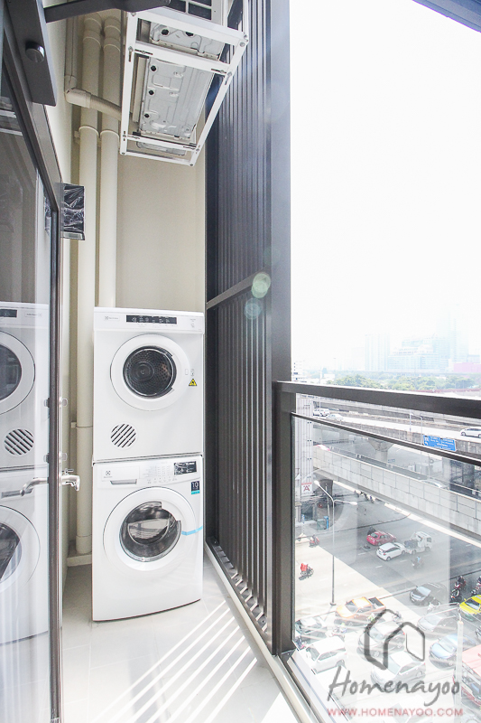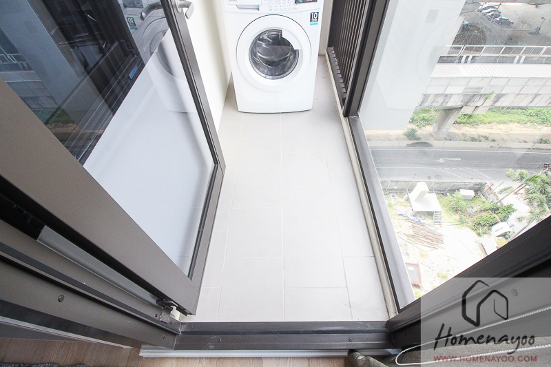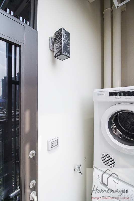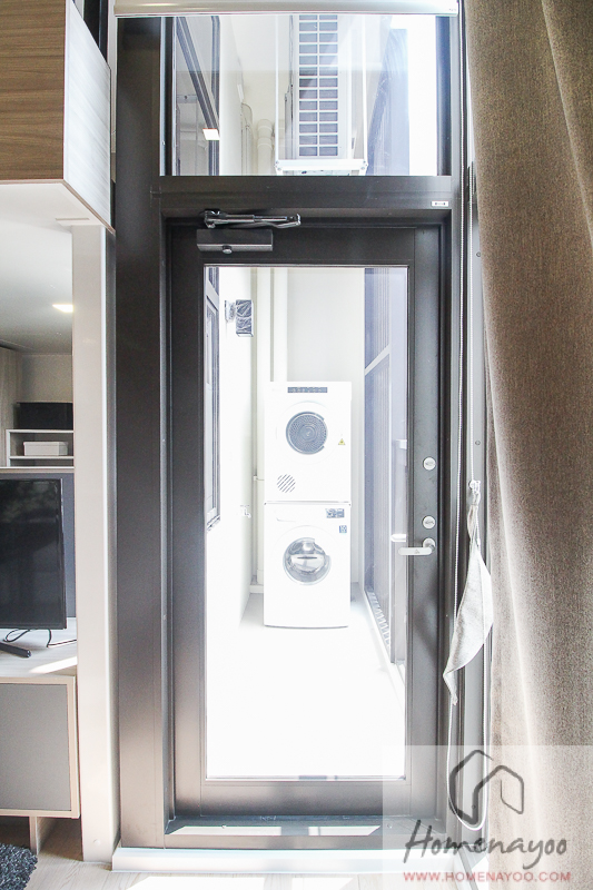 ออกมาที่ระเบียงภายนอก พื้นปูกระเบื้องเซรามิคสีครีม ราวกันตกกระจกใสนิรภัย ได้เครื่องซักผ้าและเครื่องอบผ้าติดตั้งมาให้เรียบร้อย