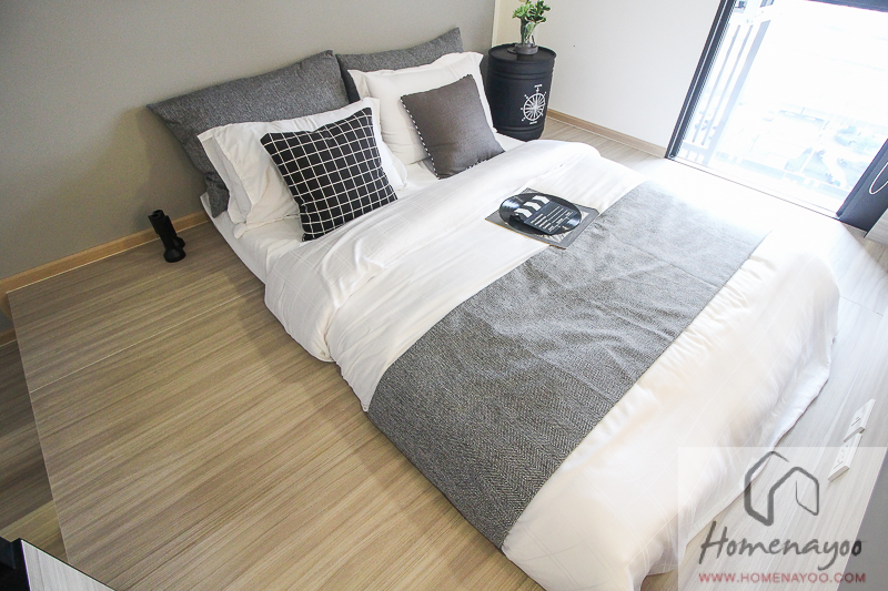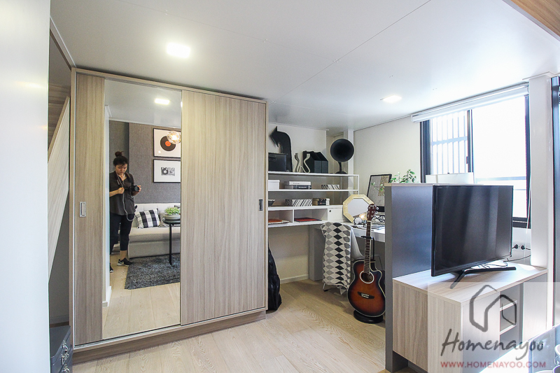 พื้นที่บนชั้นลอยนี้จะเป็นห้องนอน ขนาดกว้างกว่าห้องที่แล้วพอสมควร วางเตียงขนาด ควีนไซส์มาให้ 1 หลัง