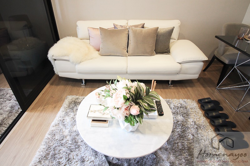 กลับมาที่ส่วนนั่งเล่นที่อยู่ถัดจากส่วนครัว และอยู่ติดกับห้องนอน ลูกค้าจะได้เฟอร์นิเจอร์ตามนี้เลยนะคะ บริเวณนี้ได้ความรู้สึกโปร่งโล่งดีทีเดียว ด้วยพื้นที่ใช้สอยและความสูงฝ้าเพดาน จัดเป็นพื้นที่นั่งเล่นที่ได้พักผ่อนดีทีเดียว