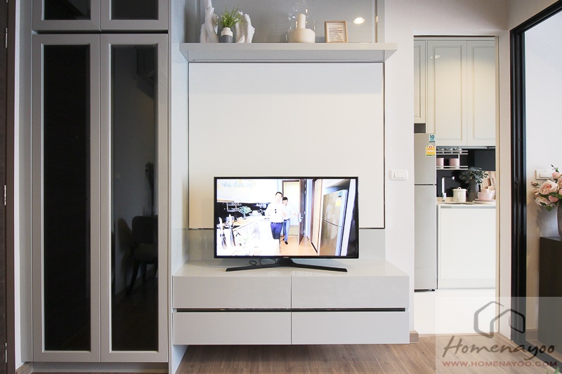 ส่วนตรงผนังเปล่าถูกบิวท์อิน Sideboard ลูกค้าจะวางทีวีแบบนี้ก็ได้ หรือ จะแขวนผนัง เพื่อเพิ่มพื้นที่ใช้สอยก็แล้วแต่สะดวกค่ะ ส่วนชั้นวางทีวีและชั้นลอยวางของก็ได้มาเหมือนห้องที่แล้ว