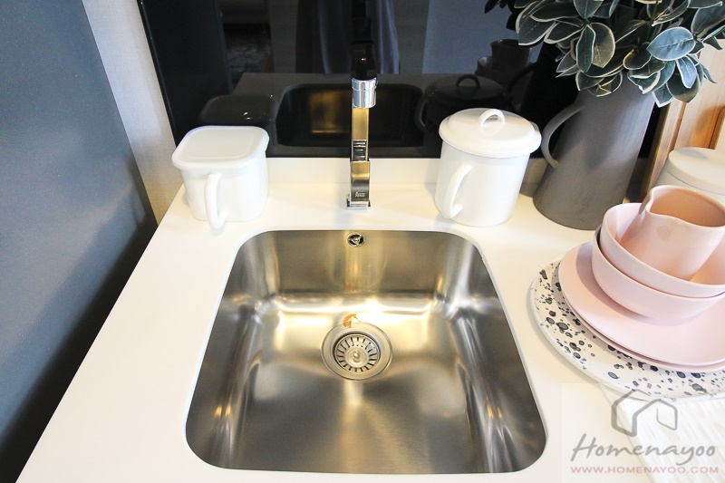 ชุดครัวที่โครงการเลือกใช้ เป็นของ Teka เคาน์เตอร์ครัว L-Shape ฝังไฟ LED Top ครัวหินสังเคราะห์ พร้อมตู้เก็บของด้านบน และ ด้านล่าง บานเปิดเปียโนไฮกลอส มี Island ที่สามารถปรับเปลี่ยนการใช้งานได้ตามต้องการ ไม่ว่าจะทำเป็น Pantry สำหรับเตรียมอาหาร รวมถึงจัดเป็นโต๊ะทานข้าวแบบที่โครงการตกแต่งให้ดูก็ได้ค่ะ