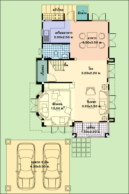 สไตล์: บ้านเดี่ยว 2 ชั้น 3 ห้องนอน 2 ห้องน้ำ ที่จอดรถ 2 คัน เด่นด้วยทางเข้าโอ่โถงกับเสาสูงรับกับช่องแสงทรงกลม ห้องรับแขก รับประทานอาหารและเตรียมอาหารต่อเนื่องกัน , ห้องนอนใหญ่ สามารถเข้าถึงห้องน้ำได้จากภายใน , 2 ห้องนอนเล็ก สามารถรวมเป็นห้องนอนใหญ่ได้