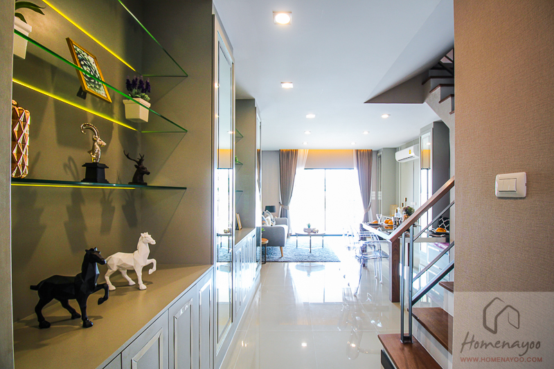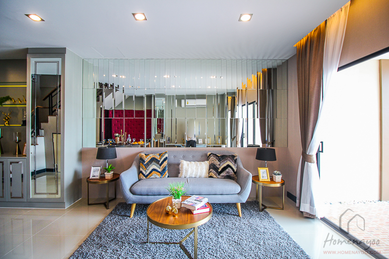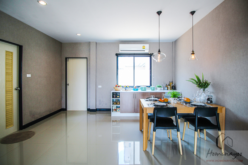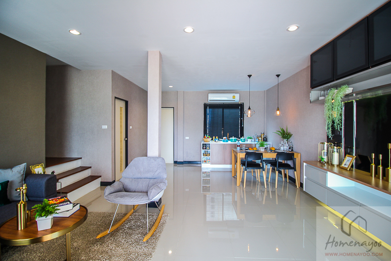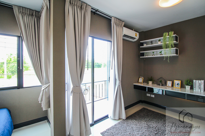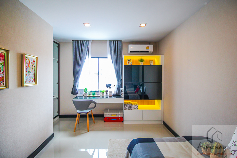 แบบบ้าน – ที่นี่มีให้เลือกหลักๆ 2 แบบคือบ้านแฝด และบ้านทาวน์โฮม บ้านรูปทรงสไตล์ Modern ใช้โทนสีขาว ครีม น้ำตาล และเทาเข้ม พื้นที่ในบ้านทาวน์โฮมทำมาได้น่าอยู่ เน้นช่องแสงเข้าถึงแต่ละส่วนภายในบ้าน แต่ละส่วนของบ้านแบ่งพื้นที่มาให้ไม่อึดอัด ดูโปร่งโล่ง ฝ้าสูง 2.6 ม. พื้นที่ในบ้านสามารถปรับเปลี่ยนได้ตามความต้องการของผู้อาศัย ด้านหลังบ้านมีพื้นที่ให้ต่อเติมได้อีก ที่ชั้นบนห้องนอนแต่ละห้องแบ่งพื้นที่มาได้กว้างดีสามารถวางตู้ โต๊ะ เตียงได้ครบ