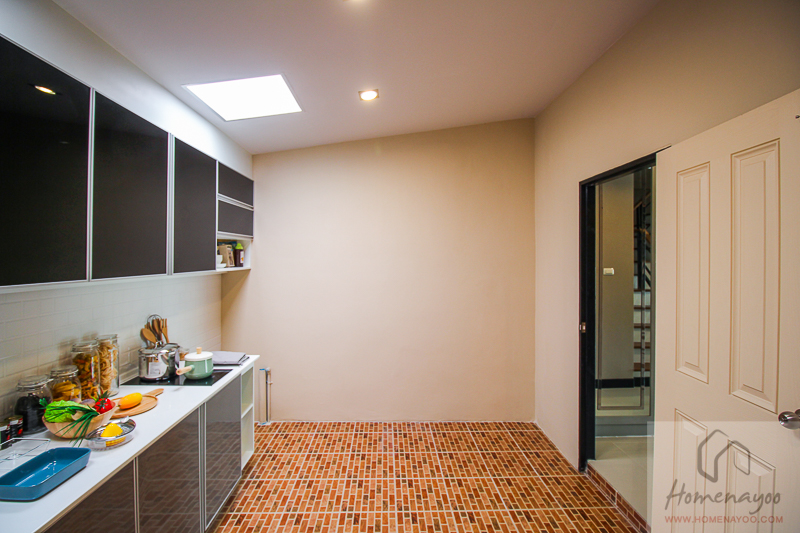 ออกจากห้องน้ำมาจะเป็นพื้นที่ส่วนครัว ซ้ายมือเป็นห้องนอน 4 ตรงหน้าเป็นประตูออกไปหลังบ้าน