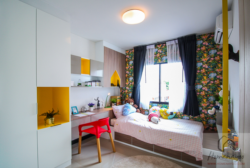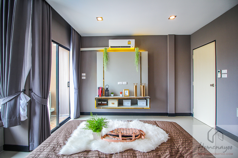 ฝั่งปลายเตียงมีพื้นที่ไว้ให้วางตู้เสื้อผ้า ชั้นวางของได้พอสมควร