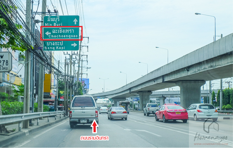 เริ่มจากถนนรามอินทรามุ่งหน้าไปทางฉะเชิงเทรา ซ้ายมือเป็น Fashion Island