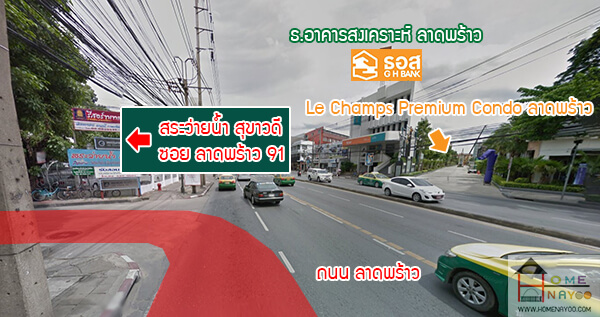 จากนั้นเลี้ยวซ้ายเข้าสู่ ซอยลาดพร้าว 91 ฝั่งตรงข้ามเป็น Le Champs Premium Condo ลาดพร้าว