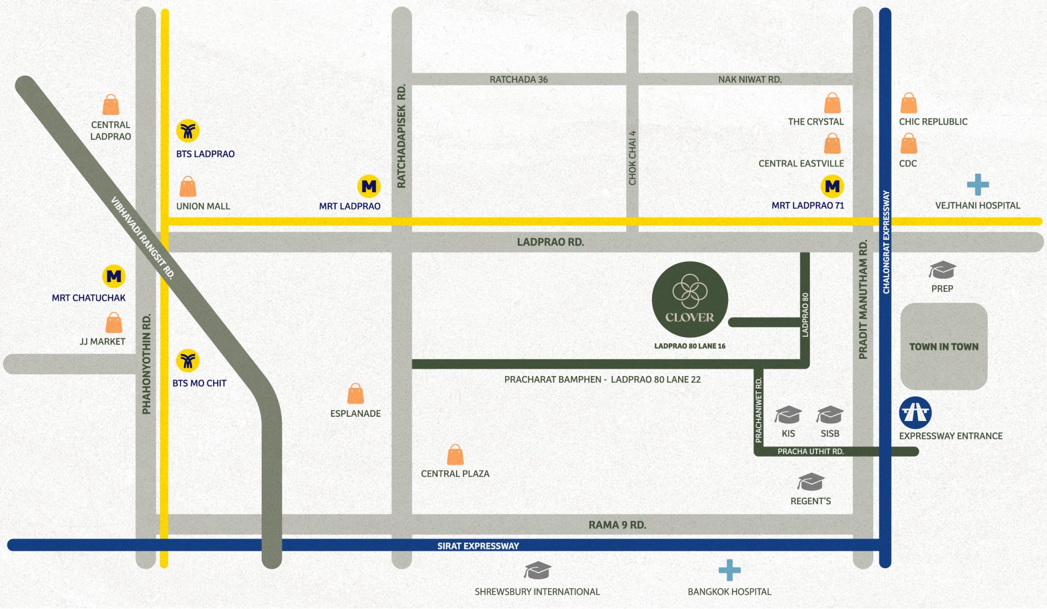 Clover รัชดา-ลาดพร้าว ทาวน์โฮมและบ้านแฝดใหม่จาก Wynn Property ที่ตั้งโครงการอยู่ภายซอยลาดพร้าว 80 แยก 16 แขวงวังทองหลาง เขตวังทองหลาง กทม. เดินทางสะดวกสบาย เชื่อมต่อทางด่วนฉลองรัชได้สะดวก ใกล้รถไฟฟ้าสายสีเหลือง สถานีลาดพร้าว 71 เพียง 800 ม.*