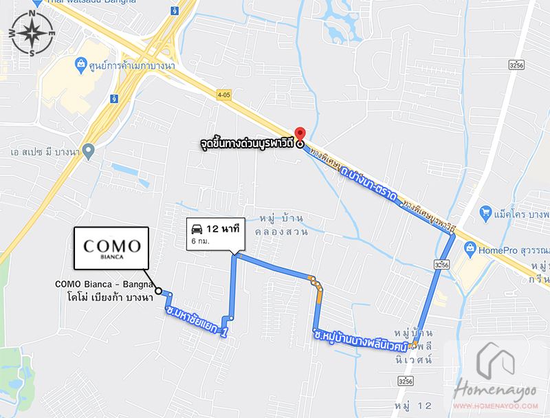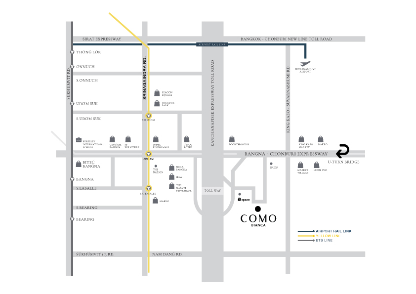 จากทางเข้า a space ME บางนา → ตรงมาตามทางประมาณ 2 กม. จะเจอทางเข้าโครงการ Como Bianca บางนา อยู่ทางขวามือ