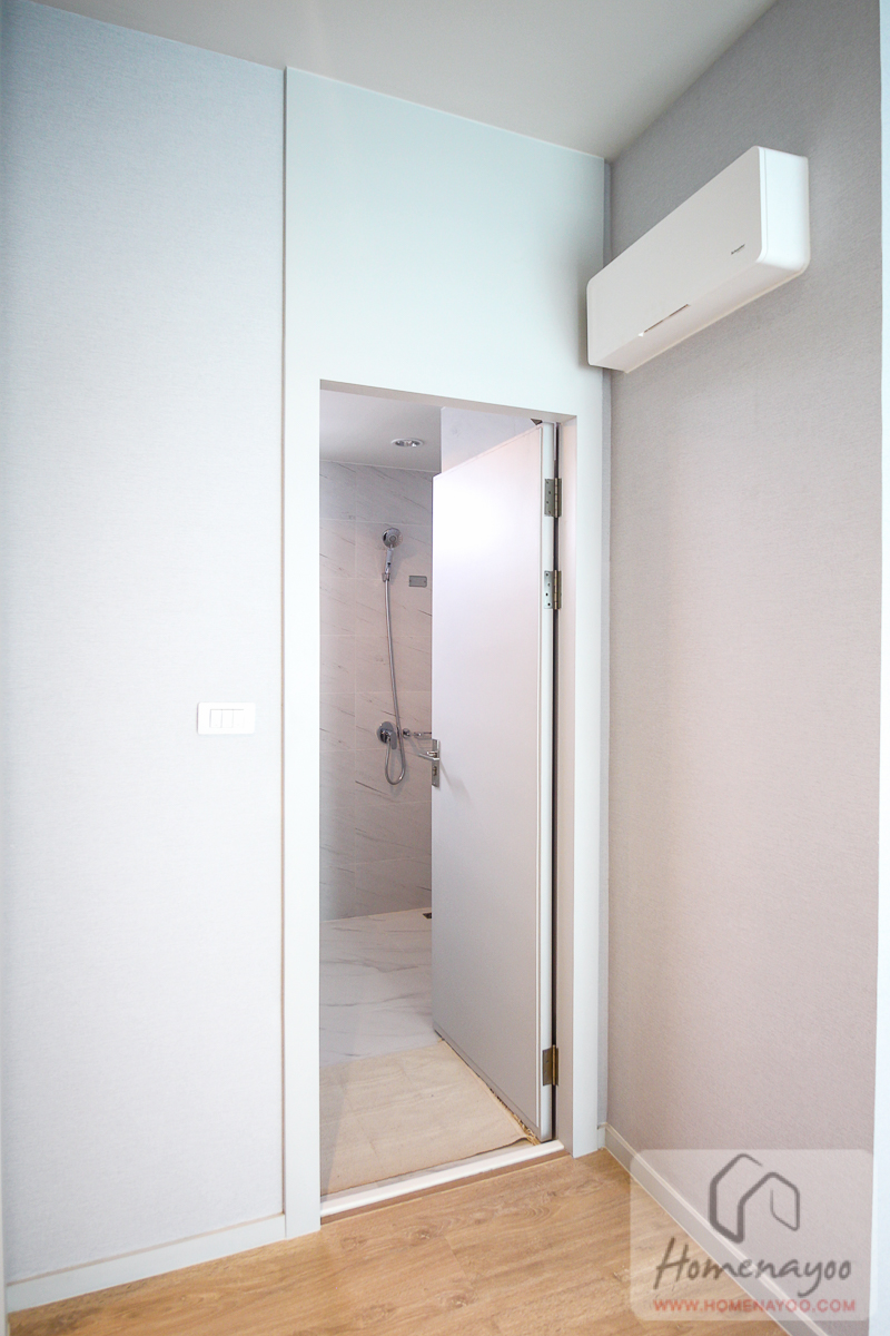 จะมีส่วนอาบน้ำพร้อมฉากกั้นอาบน้ำมาให้ เพื่อแยกส่วนเปียกส่วนแห้งมาให้ พื้นปูกระเบื้องเซรามิกขนาด 30 x 30 cm. ลดระดับลงจากพื้นห้องนั่งเล่นประมาณ 5 เซนติเมตร