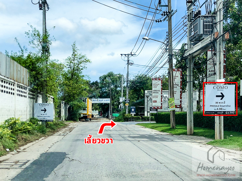 เราเลี้ยวขวาขึ้นสะพานข้ามคลองไป ข้างสะพานจะมีป้าย Areeya และโครงการต่างๆของอารียาติดอยู่