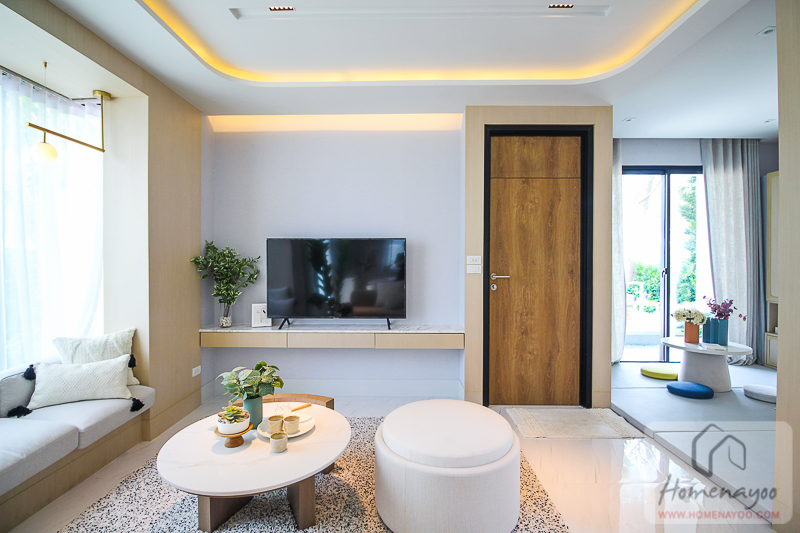 ระยะห่างจากโซฟากับชั้นวางทีวีอยู่ที่ประมาณ 3 เมตร สามารถวางทีวีจอกว้างขนาด 60 – 70 นิ้วได้สบายๆ