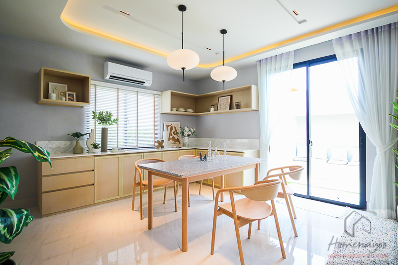 ถัดจากส่วนห้องนั่งเล่นมา เป็นส่วนห้องรับประทานอาหาร จัดมา 4 ที่นั่ง จริงๆสามารถจัดได้ถึง 6-8 ที่นั่งสบายๆนะคะ มีระยะกว้างพอค่ะ แต่บ้านตัวอย่างทำบิ้ลท์อิน เคาน์เตอร์ครัวแบบ Pantry ติดผนังมาให้ดูระยะใช้งาน