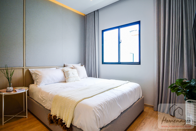 เข้ามาจะเห็นว่าห้องนอนมีขนาดสบายๆ สามารถวางเตียงคู่ 5 ฟุตได้ และมีพื้นที่ข้างเตียงให้วางโต๊ะข้าง ตู้เสื้อผ้า ชั้นวางทีวีได้ มีหน้าต่างบานเลื่อนคู่ฝั่งข้างเตียงมาให้ 1 ชุด