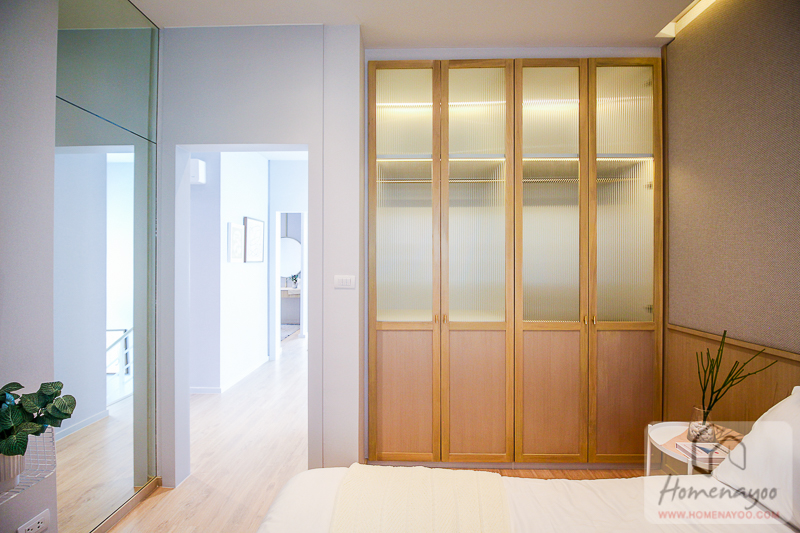 ผนังข้างเตียงทำ Built in ตู้เสื้อผ้ามาให้ดูระยะใช้งาน พร้อมวางโต๊ะข้างเตียงมาให้ จะเห็นว่ามีระยะเดินไปเดินมาสบายๆ