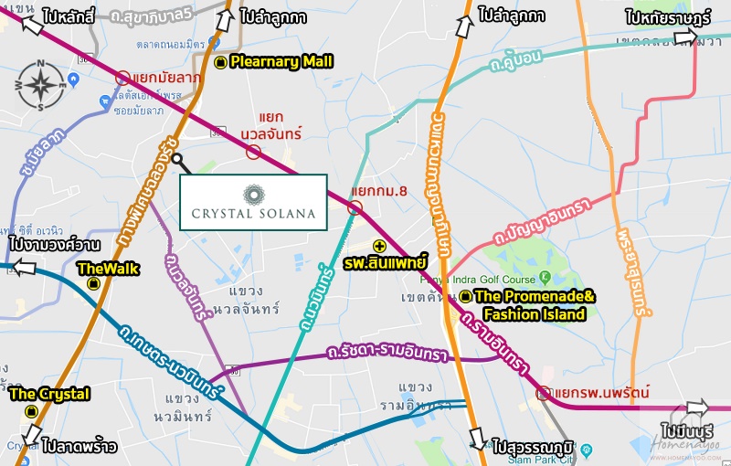 ทำเลที่ตั้งโครงการ Crystal Solana ถือว่าเป็นที่ทำเลที่น่าสนใจ และถือว่า Prime เลยสำหรับเส้นเลียบทางด่วนเอกมัย-รามอินทรา เห็นได้จากหมู่บ้านที่ถูกนำมาพัฒนาส่วนใหญ่จะเป็นหมู่บ้านหรูระดับ Luxury ขึ้นไป ด้วยราคาที่ดินที่แพงมากขึ้นจากการเดินทางที่สะดวกสบายและสาธารณูปโภคของพื้นที่ โดยจุดที่โครงการตั้งอยู่จะอยู่ใกล้กับจุดขึ้นทางด่วนฉลองรัชทั้งขาเข้าเมืองและขากลับเข้าโครงการ รวมไปถึงรถไฟฟ้าทั้ง 2 สาย เป็นสายสีชมพูและสายสีเทา ถือเป็นทำเลที่เป็นทรัพย์สินที่สร้างมูลค่าเพิ่มได้ดีค่ะ