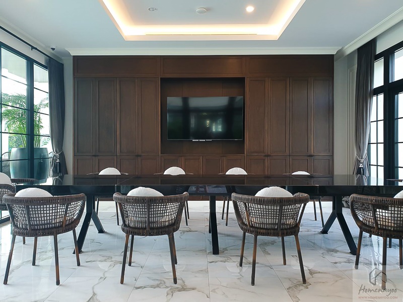 Residents’ Lounge เป็นห้องอเนกประสงค์ที่รองรับการใช้งานได้หลายรูปแบบ จะใช้จัดพวกปาร์ตี้งานวันเกิดก็ทำได้ โดยการออกแบบภายในจะทำให้ดูโอ่อ่าด้วยฝ้าเพดานสูงเท่ากับโซน Semi-Outdoor และเปิดรับวิวด้วยประตูกระจกทั้ง 4 ด้าน และยังสามารถเปิดเชื่อมต่อกับพื้นที่สระว่ายน้ำได้ด้วยค่ะ