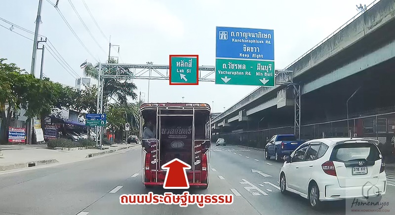 เราเริ่มต้นการเดินทางจากบนถนนเลียบทางด่วนเอกมัย-รามอินทรา หรือถนนประดิษฐ์มนูธรรม โดยมุ่งหน้าไปทางรามอินทรากันค่ะ พอเลยถนนลาดพร้าวมาแล้วทางฝั่งซ้ายมือเราจะผ่าน Central Festival Eastville