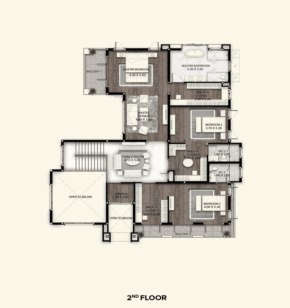แปลนชั้น 2 เป็นพื้นที่อยู่อาศัยของเจ้าของบ้าน จะมีการออกแบบโดยแบ่งเป็น 2 ปีก ปีกหน้าบ้านคือ Great Room เป็นห้องนั่งเล่นและห้องรับแขก ส่วนปีกหลังบ้านเป็น Gourmet Kitchen ครัวฝรั่งขนาดใหญ่, Powder Room และห้องนอน 4 ซึ่งทั้ง 2 ปีกนี้จะเชื่อมต่อกันด้วย Dining Area ตรงกลางโถงลิฟต์และโถงบันได ทำให้แปลนบ้านออกมาเป็นรูปตัว U ค่ะ