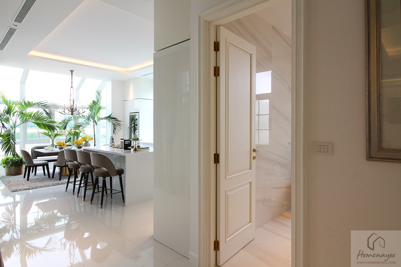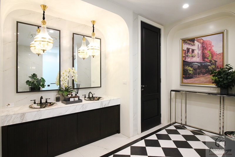 อยากให้สังเกตการตกแต่งผนังในส่วนนี้นิดนึงค่ะ ทางโครงการเลือกใช้เป็นหินอ่อนนำเข้าจากอิตาลีลาย Panda White มาต่อ Bookmatch อย่างสวยงาม เรียกว่าเป็นอีก 1 คุณค่าที่ทางโครงการทำมาให้