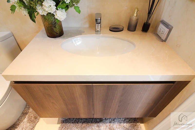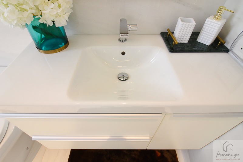 เริ่มจากอ่างล้างมือเป็นอ่างฝังบนเคาน์เตอร์ Top ใช้เป็น Acrylic Surface ติดก๊อกน้ำสีโครเมี่ยม ส่วนตัวเคาน์เตอร์ใช้ของแบรนด์ Modern Form เราสามารถทำการ Costumize ตัว Top, ตัวเคาน์เตอร์ และก๊อกน้ำได้ค่ะ