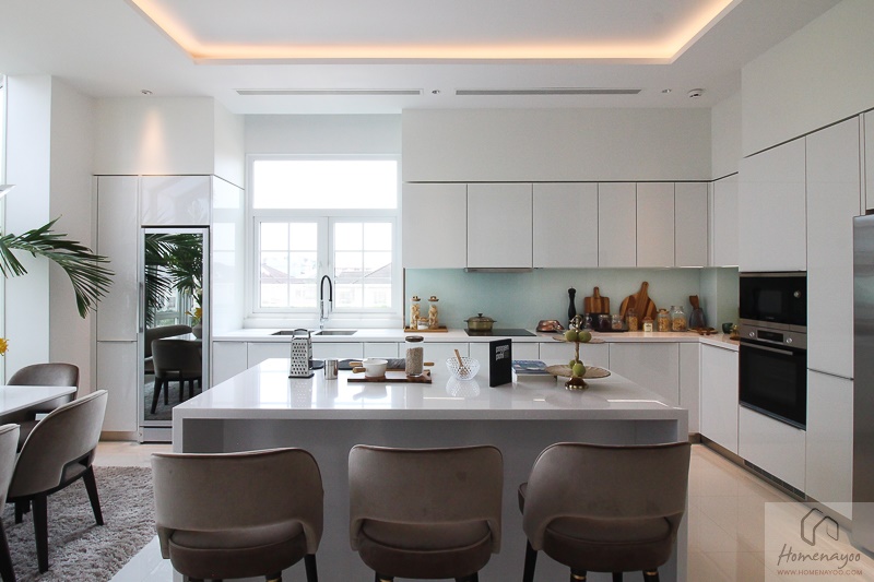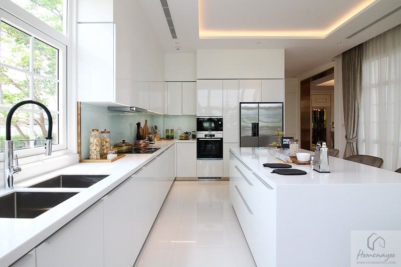 โดยทางโครงการเขาก็จะให้ชุดเคาน์เตอร์ครัวของ Poggenpohl รุ่น Standard มาให้ ได้ครบทั้ง Hob, Hood, Sink, Oven และ Microwave Oven ของแบรนด์ Bosch ใช้ Top หินควอทซ์ ซึ่งที่เราเห็นอยู่ให้ห้องนี้จะเป็นรุ่นอัปเกรด แต่ถ้าใครที่ต้องการรุ่นที่สวยหรือหรูหรากว่านี้ก็สามารถปรึกษากับทางโครงการได้ค่ะ