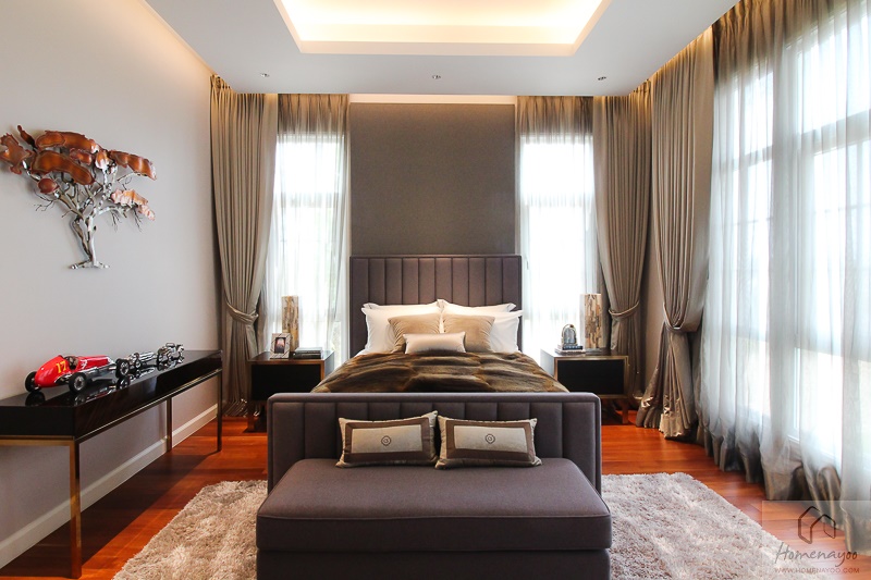 พื้นที่ภายในห้องนี้มีขนาดใหญ่และก็มีช่องแสงให้เยอะ พอวางเฟอร์นิเจอร์แล้วห้องก็ยังดูโปร่งอยู่ ไม่ว่าจะเป็นเตียงขนาด 6 ฟุต โต๊ะข้าง, คอนโซล, สตูลปลายเตียง