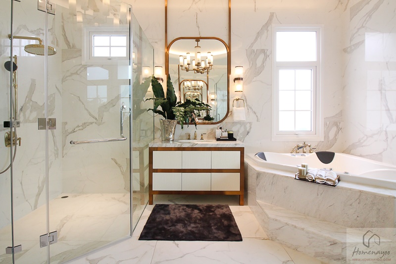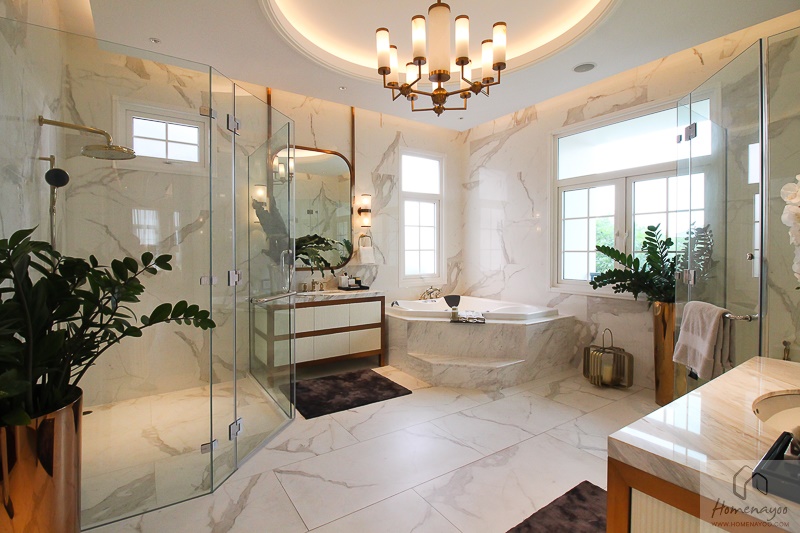 ภายในห้องน้ำของ Master Bedroom มีการตกแต่งมาได้สวยมาก พวกพื้นและผนังห้องน้ำจะตกแต่งด้วย Italian Surface มีลายสวย ๆ ให้เลือกได้หลายลาย พวกลายที่เป็นที่นิยมอย่าง Calacatta หรือ White Volakas ก็มีให้เลือกด้วยนะ