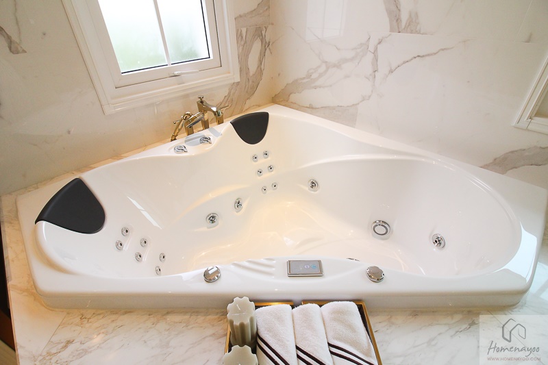 ส่วน Highlight ของห้องน้ำก็จะเป็นอ่างอาบน้ำขนาดใหญ่แบบฝังเข้ามุม มาพร้อมกับหัว Jet และหมอนรองคอสำหรับ 2 คนนอนแช่ได้พร้อมกัน