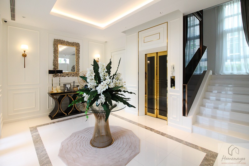 พอเราผ่าน Foyer เข้ามาด้านในจะเป็น Hall Way เป็นส่วนของ โถงลิฟต์, โถงบันได หรือจะเรียกว่าเป็นโถงต้อนรับอีกส่วนก็ได้ เพราะส่วนนี้จะมีประตูที่เชื่อมมาจากโรงจอดรถ เวลาเราจะออกจากบ้านหรือกลับเข้าบ้าน ก็จะใช้ประตูกระจกฝั่งนี้ในการเข้า-ออกได้