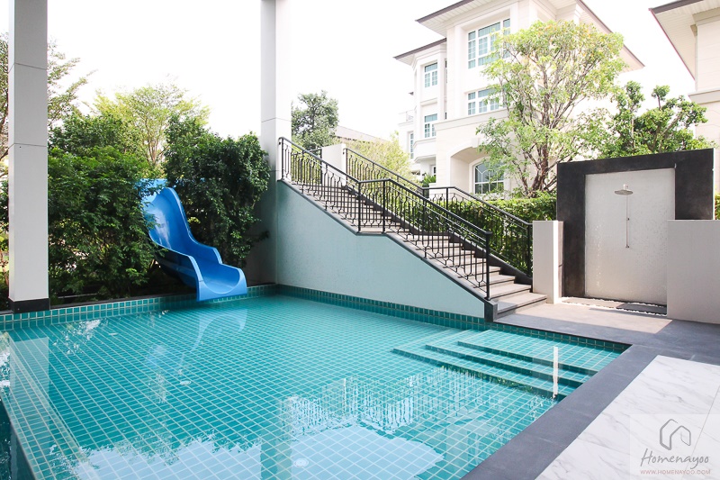 ภายในสระยังมีการแบ่งเป็นโซนสระเด็กพร้อมจัด Slider เอาไว้ให้ ข้าง ๆ กันเป็นโซน Shower สำหรับล้างตัวก่อนลงสระ