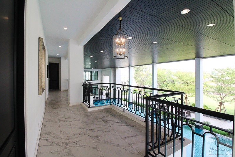 พื้นที่ระเบียงฝั่งหน้าบ้าน ออกไปยืนสูบซิการ์รับลมสบาย ๆ ได้ ราวกันตกที่ติดตั้งมาให้จะใช้เป็นเหล็ก Wrouht Iron ทำสี Powder Coat สามารถเลือกลายได้เช่นกัน