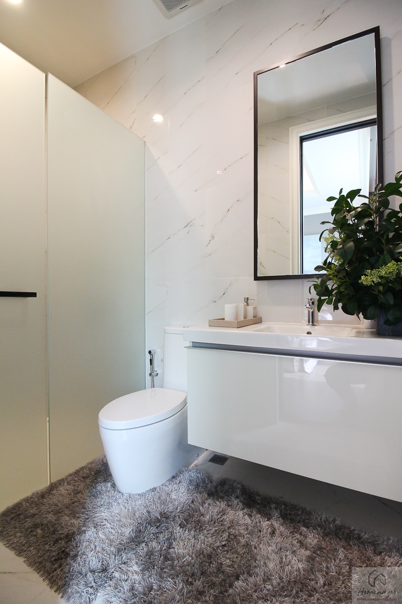 ห้องน้ำของ Master Bedroom จะเป็นห้องน้ำแบบ Full Function มีอ่างล้างมือแบบ His & Her แยกฝั่งกัน มีการกั้นโซนโถสุขภัณฑ์และโซนอาบน้ำให้ด้วย Tempered Glass
