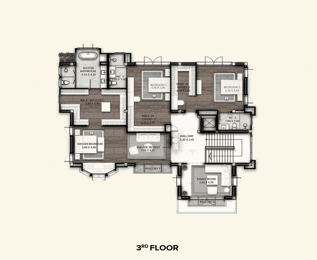 แปลนชั้น 3 เป็นพื้นที่อยู่อาศัยของเจ้าของบ้านเช่นกัน แต่จะมีความ Private มากขึ้นเนื่องจากเป็นฟังก์ชันของห้องนอนทั้งหมดเลย โดยจะมีห้องนอนทั้งหมด 3 ห้องด้วยกัน และเชื่อมต่อกันด้วย Family Area เป็นโถงส่วนกลาง โดย Master Bedroom จะอยู่ที่ฝั่งหน้าบ้าน ส่วนห้องนอน 2 และ 3 จะอยู่ฝั่งหลังบ้านค่ะ