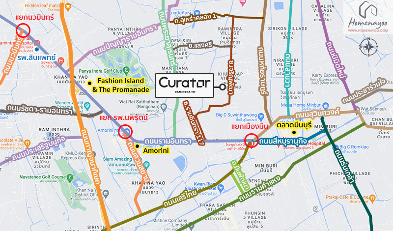 โครงการ Curator รามอินทรา 117 ตั้งอยู่ในซอยเจริญพัฒนา ที่มีบรรยากาศการอยู่อาศัยโดยรอบของโครงการมีความเป็นชุมชน พื้นที่โดยรอบส่วนใหญ่เป็นที่อยู่อาศัยแนวราบและที่ดินเปล่าค่ะ โดยที่ตั้งของโครงการนี้จะถือว่าอยู่บนทำเลรามอินทราซึ่งเป็นโซนที่อยู่อาศัยขนาดใหญ่โซนหนึ่งในกรุงเทพ จึงมีสิ่งอำนวยความสะดวกรองรับครบ และไม่ไกลจากตัวโครงการ ทั้ง Fashion Island, The Promenade, Lotus’s, Big C, ตลาดมีนบุรี รวมถึง โรงพยาบาลและสถานศึกษาแถวนี้ก็มีหลายแห่ง
