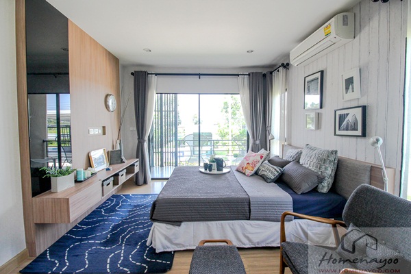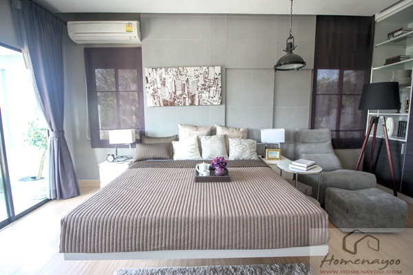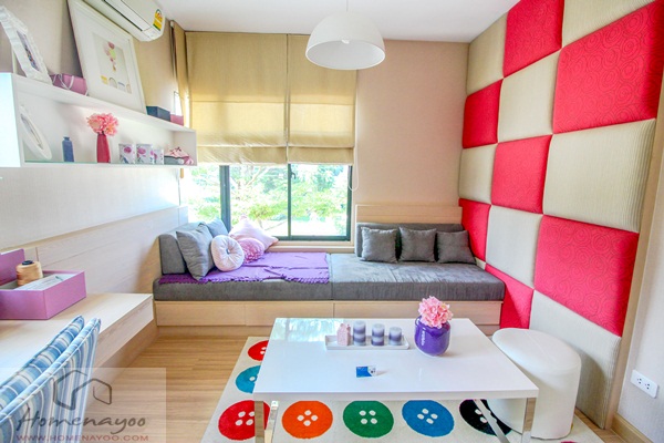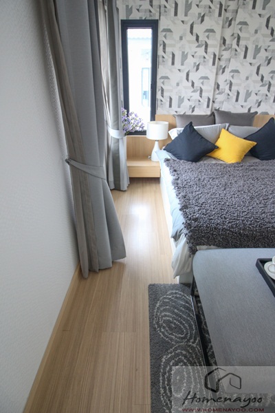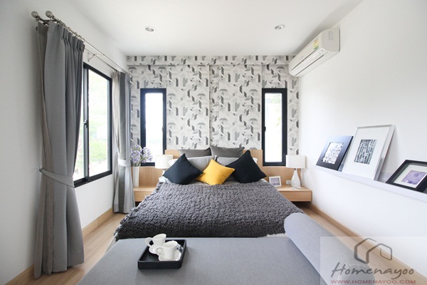 ภาพจากปลายเตียงไปยังหัวเตียง ซึ่งเตียง Day Bed เตียงนี้ ทางโครงการวางแบบชิดหน้าต่างค่ะ ทำให้มีพื้นที่ข้างเตียงกว้างขวาง