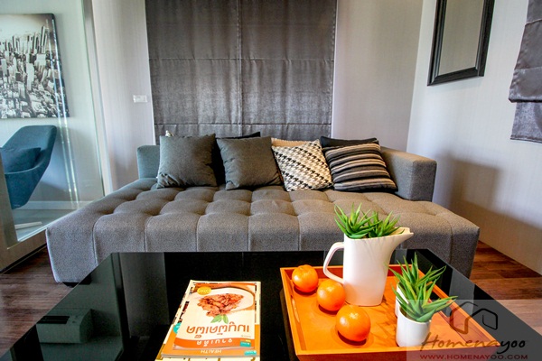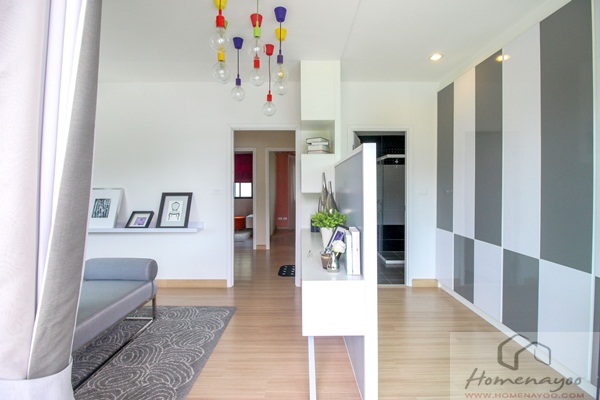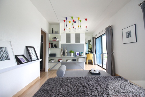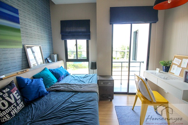 นี่คือภาพแรกที่มองเข้ามายังห้องนอนค่ะ ทางโครงการตกแต่งแบบเตียงนอนกึ่ง Day Bed ฝั่งตรงข้ามเตียงเป็นโต๊ะทำงานติดตั้งลอย Build-in