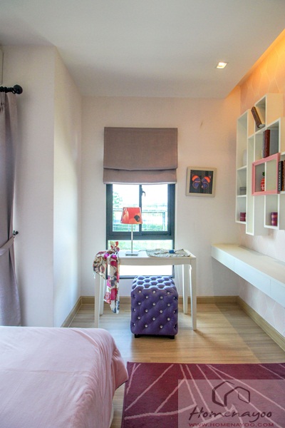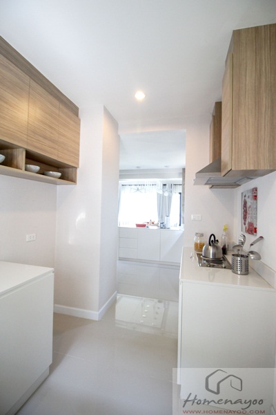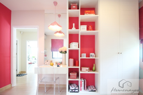 พื้นที่เว้าด้านข้างระเบียงทางโครงการทำเป็นพื้นที่อ่านหนังสือค่ะ ซึ่งจริงๆแล้วอาจทำเป็นโต๊ะเครื่องแป้งแทนได้