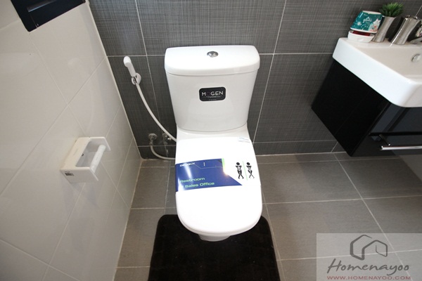 ข้างอ่างล้างมือเป็นโถสุขภัณฑ์ยี่ห้อ Mogen พื้นที่ข้างโถด้านซ้าย 45 .ม. ส่วนด้านขวา 30 ซม.