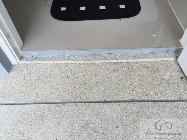 ราวระเบียงเหล็กทาสีน้ำมัน ยิดติดกับพื้นกระเบื้อง ไม่มีก่อลูกปูดขึ้นมารับ พื้นระเบียงทำระดับลาดลงออกนอกระเบียงเพื่อระบายน้ำ ไม่มีตะแกรงระบายน้ำ