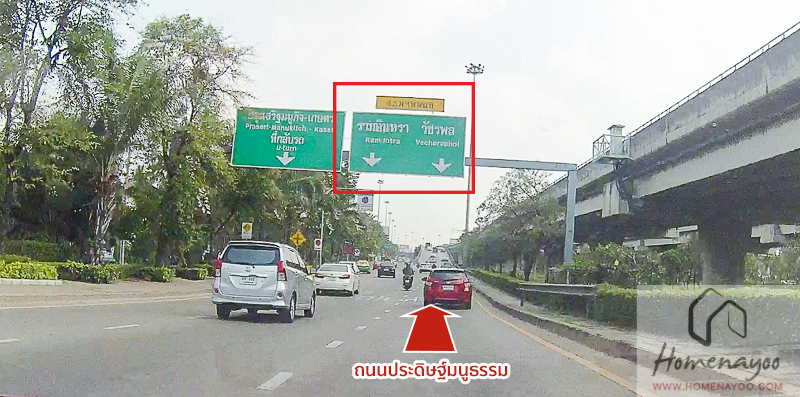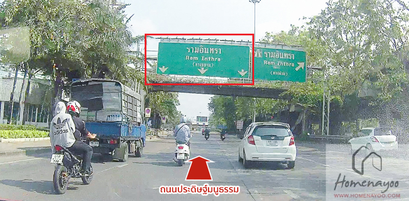 ขับตรงต่อมาเรื่อยๆ เราจะเห็นป้ายบอกทางไปถนนรามอินทรา ให้เราใช้เลนขวา