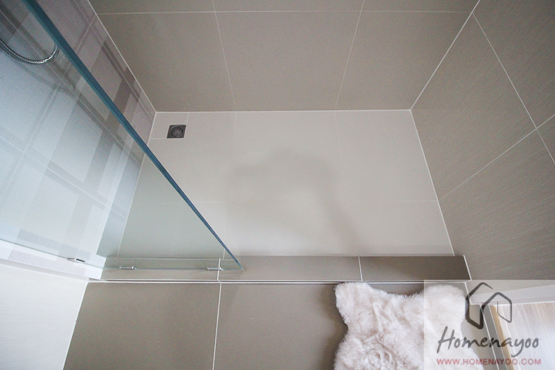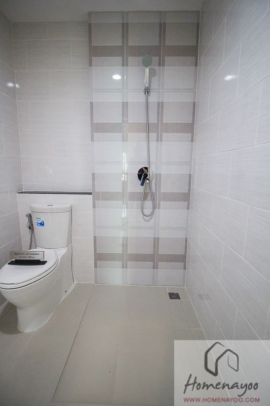 พื้นที่ส่วนห้องอาบน้ำมีพื้นลดระดับลงไปประมาณ 3 ซม. ติดตั้งฝักบัวมาให้พร้อมใช้งาน
