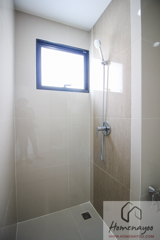 พื้นที่ส่วนห้องอาบน้ำ มีช่องแสง 1 บาน เป็นหน้าต่างบานกระทุ้ง พื้นจะลดระดับลงไปประมาณ 2 ซม. ภายในติดตั้งฝักบัวแบบ Hand Shower