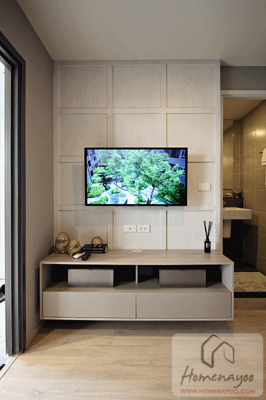 มองไปทางชั้นวางทีวี Built in ชั้นวางของใต้ทีวีมาให้ ของจริงได้ตามนี้ ด้านข้างเป็นประตูห้องน้ำ