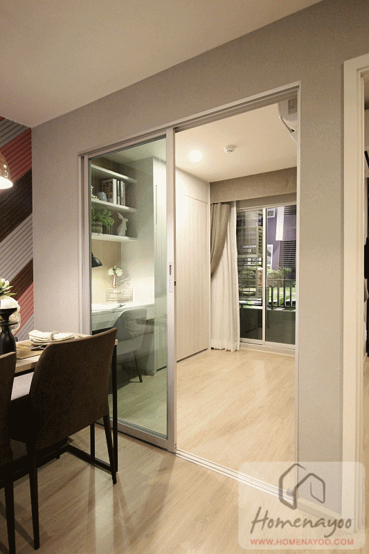 ถัดมาเป็นส่วนห้องอเนกประสงค์ มีฉากกั้นห้องเป็นกระจกใสกรอบอลูมิเนียมสีธรรมชาติแบบ 2 บาน กั้นมาให้เป็นสัดส่วน สามารถเปิดออกไประเบียงได้ และใช้เป็นห้องนอนเล็กอีกห้องได้แบบกำลังเหมาะค่ะ ใครเสื้อผ้าเยอะใช้เป็นห้องแต่งตัว หรือห้องทำงาน หรือห้องเล่นโยคะก็ได้ เป็นห้องที่ใช้ปรับตามไลฟ์สไตล์ของผู้ใช้งานได้ดี
