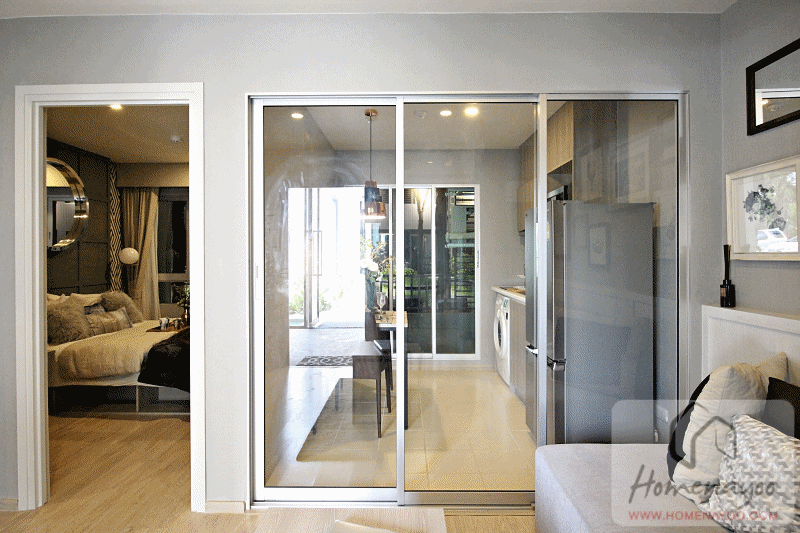 ถัดมาเป็นส่วนครัวปิด มีฉากกั้นห้องเป็นกระจกใสกรอบอลูมิเนียมสีธรรมชาติแบบ 3 บาน กั้นมาให้เป็นสัดส่วน ข้อดีคือมีช่องเปิดกว้างกว่าแบบ 2 บาน และช่วยกันกลิ่นอาหารจากครัวเข้าไปในส่วนห้องนอนและห้องนั่งเล่น