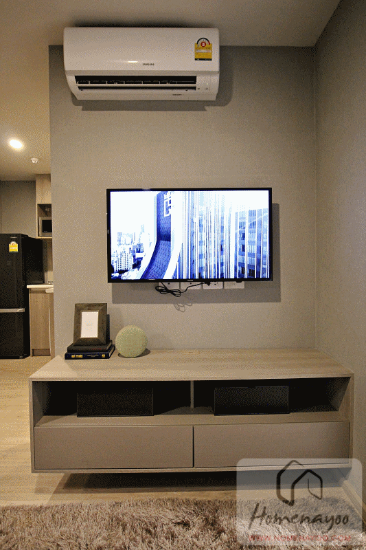 มองไปทางชั้นวางทีวี Built in ชั้นวางของใต้ทีวีมาให้ ของจริงได้ตามนี้ เปิดลิ้นชักแและช่องเก็บของใต้ชั้นวางทีวีมาให้ดู จะเห็นว่าเก็บของได้เยอะดี ที่ผนังเตรียมเต้าเสียบปลั๊กพร้อมช่องเสียบสายสัญญาณทีวีมาให้ และจะเห็นว่าติดตั้งเครื่องปรับอากาศมาให้เรียบร้อย