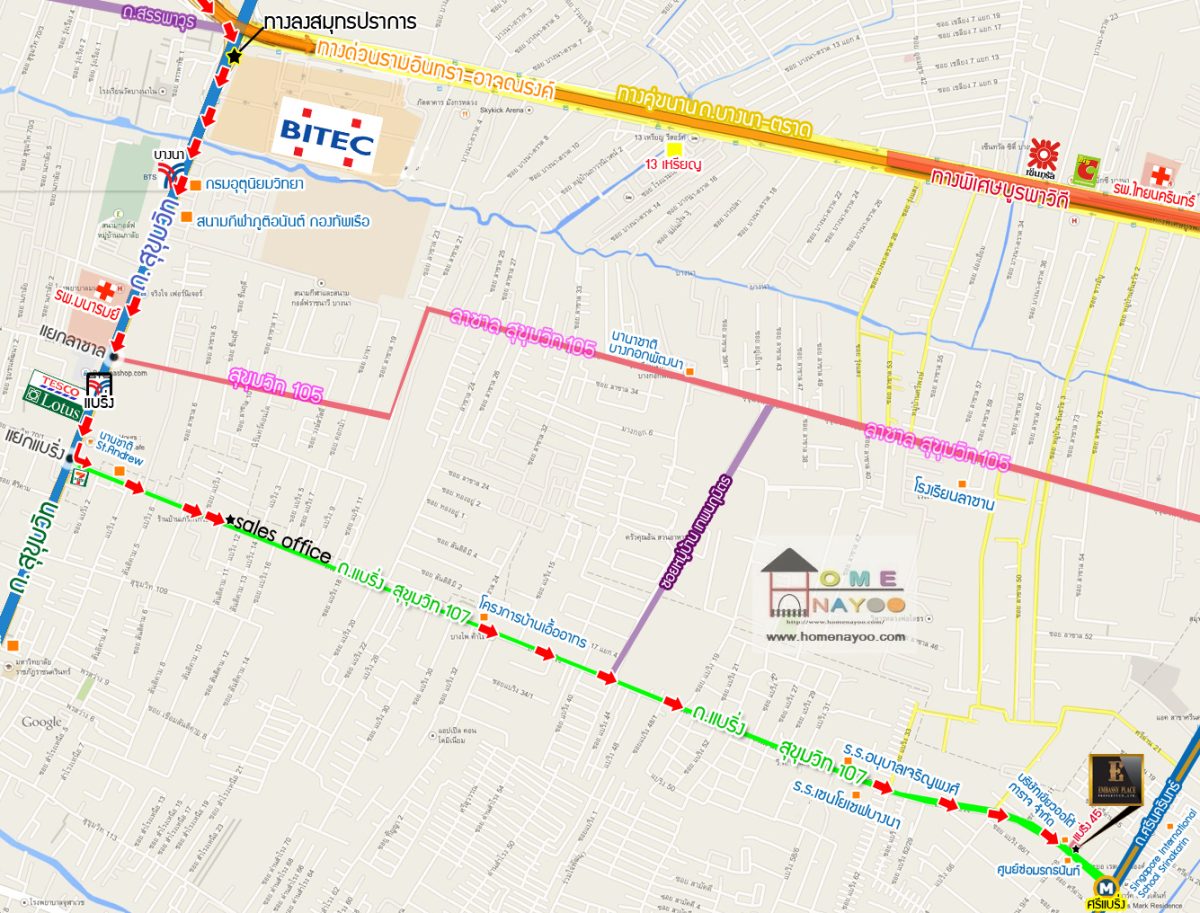 ผ่านโรงเรียนนานาชาติเซนแอนดรู ผ่านสองโครงการนะค่ะ ขับตรงประมาณสังเกตซ้ายมือ เลยซอยแบริ่ง 1 ประมาณ 100 เมตร ถึงสำนักงานขายค่ะ