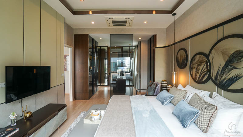 มองไปฝั่งปลายเตียงระยะดูทีวีกว้าง ติดทีวีจอขนาด 55-60 นิ้วได้ หรือจะวางโต๊ะทำงานเพิ่มอีกก็ได้